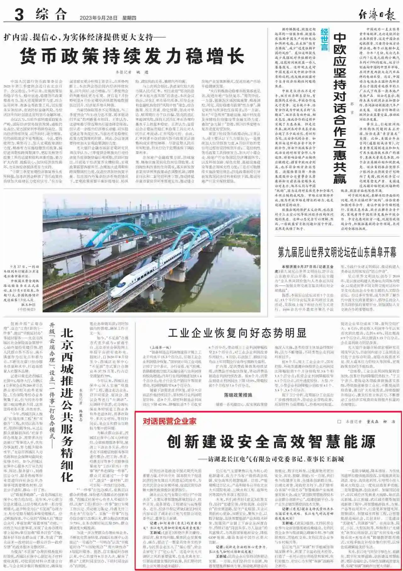 2023年9月28日,《經(jīng)濟(jì)日報》“對話民營企業(yè)家”專欄刊發(fā)了對湖北長江電氣有限公司黨委書記、董事長王新城的專訪文章——《創(chuàng)新建設(shè)安全高效智慧能源》。王新城在專訪中介紹到,長江電氣堅持自主創(chuàng)新,持續(xù)構(gòu)建智慧能源解決方案,推動能源建設(shè)向智能化、數(shù)字化轉(zhuǎn)型,讓能源使用更加安全、高效、低碳、智能。
